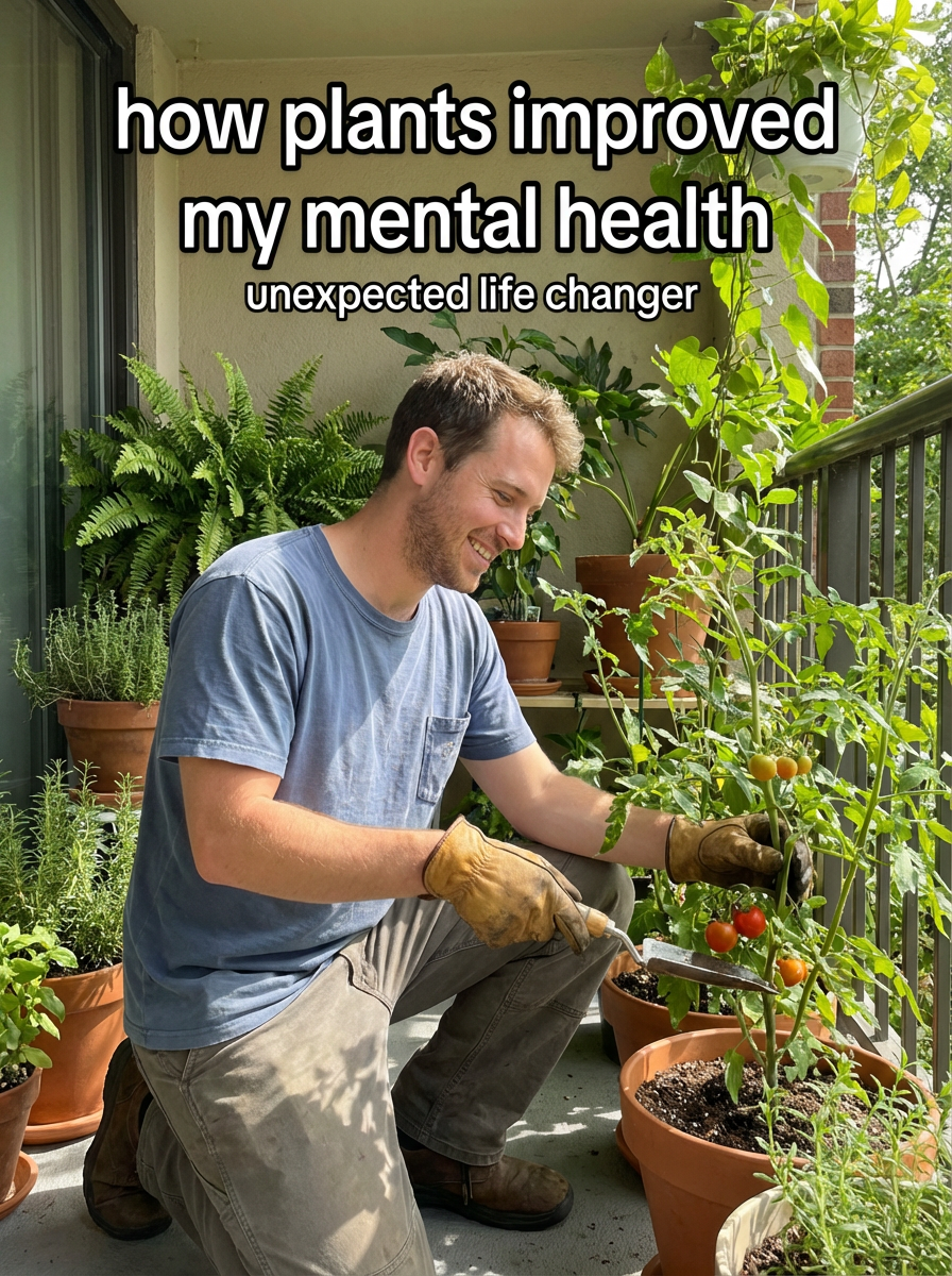 model in casual outdoor clothes tending to plants in apartment or balcony garden, natural sunlight, green plants everywhere. TikTok text overlay: "how plants improved my mental health" smaller text: "(unexpected life changer)", do not show tiktok interface