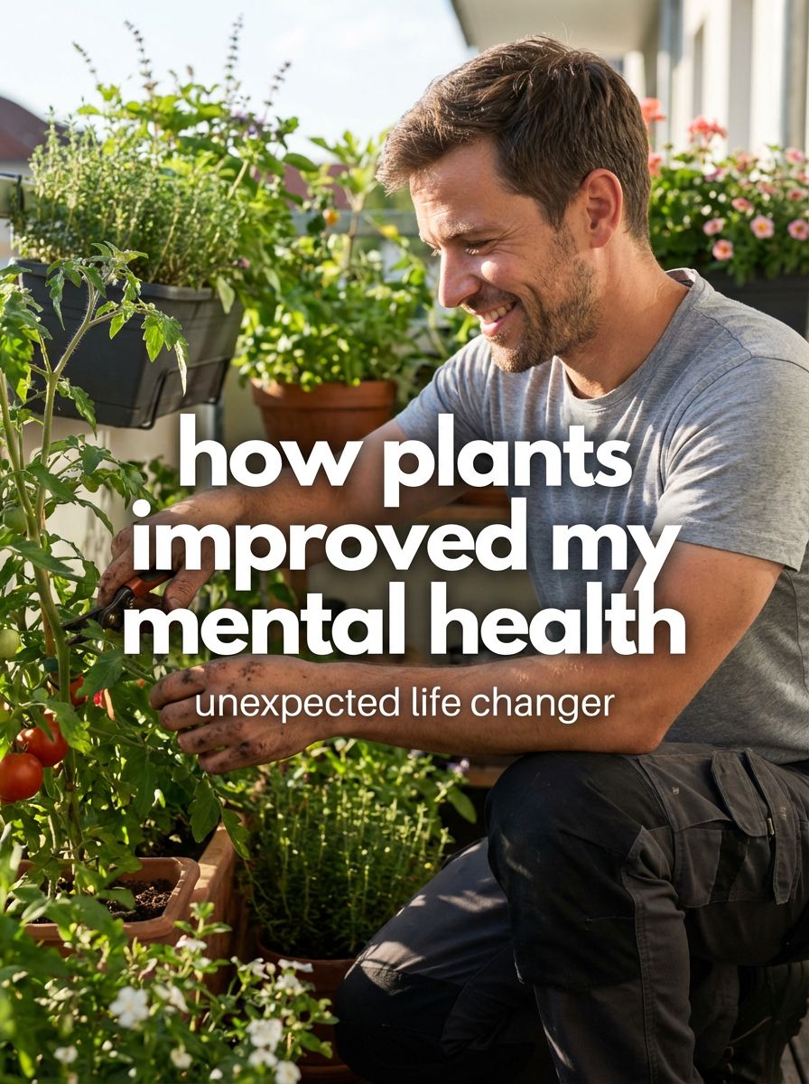 model in casual outdoor clothes tending to plants in apartment or balcony garden, natural sunlight, green plants everywhere. TikTok text overlay: "how plants improved my mental health" smaller text: "(unexpected life changer)", do not show tiktok interface