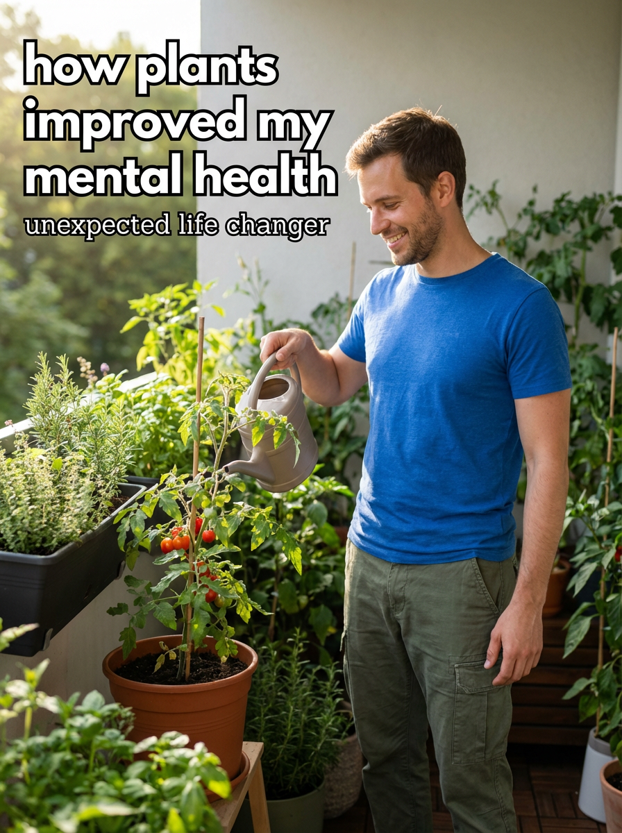 model in casual outdoor clothes tending to plants in apartment or balcony garden, natural sunlight, green plants everywhere. TikTok TikTok-style text overlay with white text with black outline: "how plants improved my mental health" smaller text: "(unexpected life changer)", do not show tiktok interface or logo