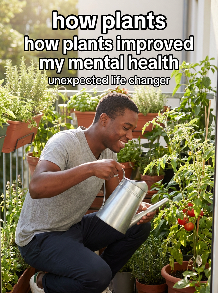 model in casual outdoor clothes tending to plants in apartment or balcony garden, natural sunlight, green plants everywhere. TikTok-style text overlay with white text with black outline: "how plants improved my mental health" smaller text: "(unexpected life changer)", do not show tiktok interface or logo