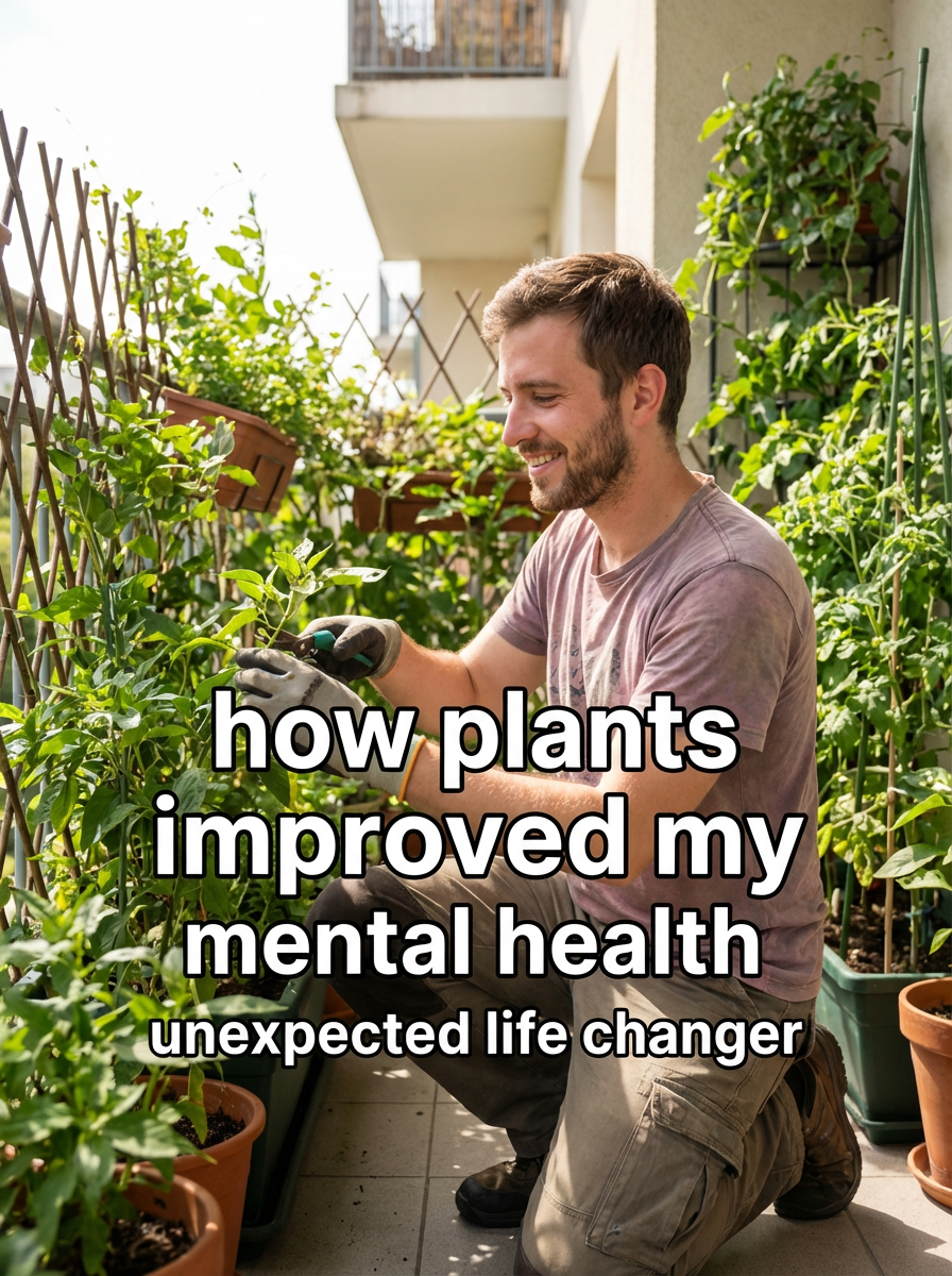 model in casual outdoor clothes tending to plants in apartment or balcony garden, natural sunlight, green plants everywhere. TikTok-style text overlay with white text with black outline: "how plants improved my mental health" smaller text: "(unexpected life changer)", do not show tiktok interface or logo