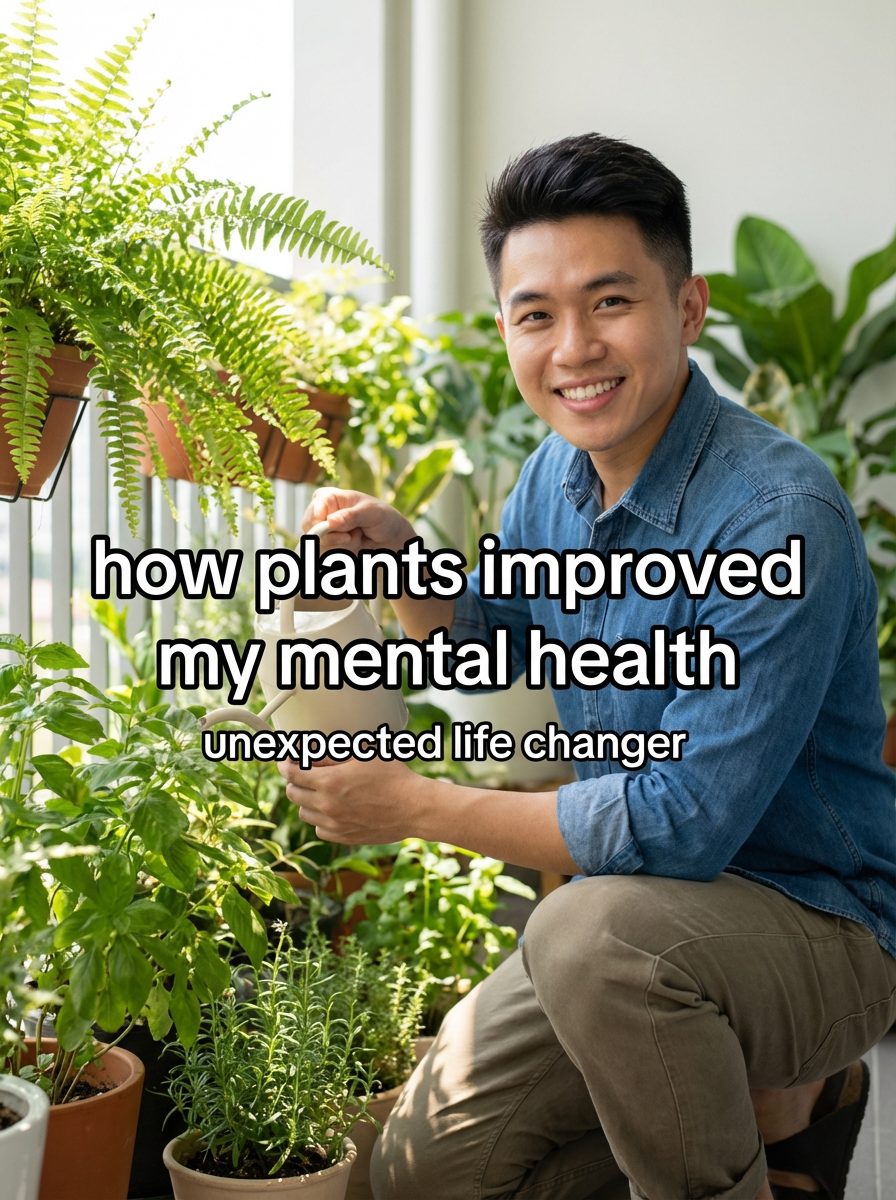 model in casual outdoor clothes tending to plants in apartment or balcony garden, natural sunlight, green plants everywhere. TikTok-style text overlay with white text with black outline: "how plants improved my mental health" smaller text: "(unexpected life changer)", do not show tiktok interface or logo