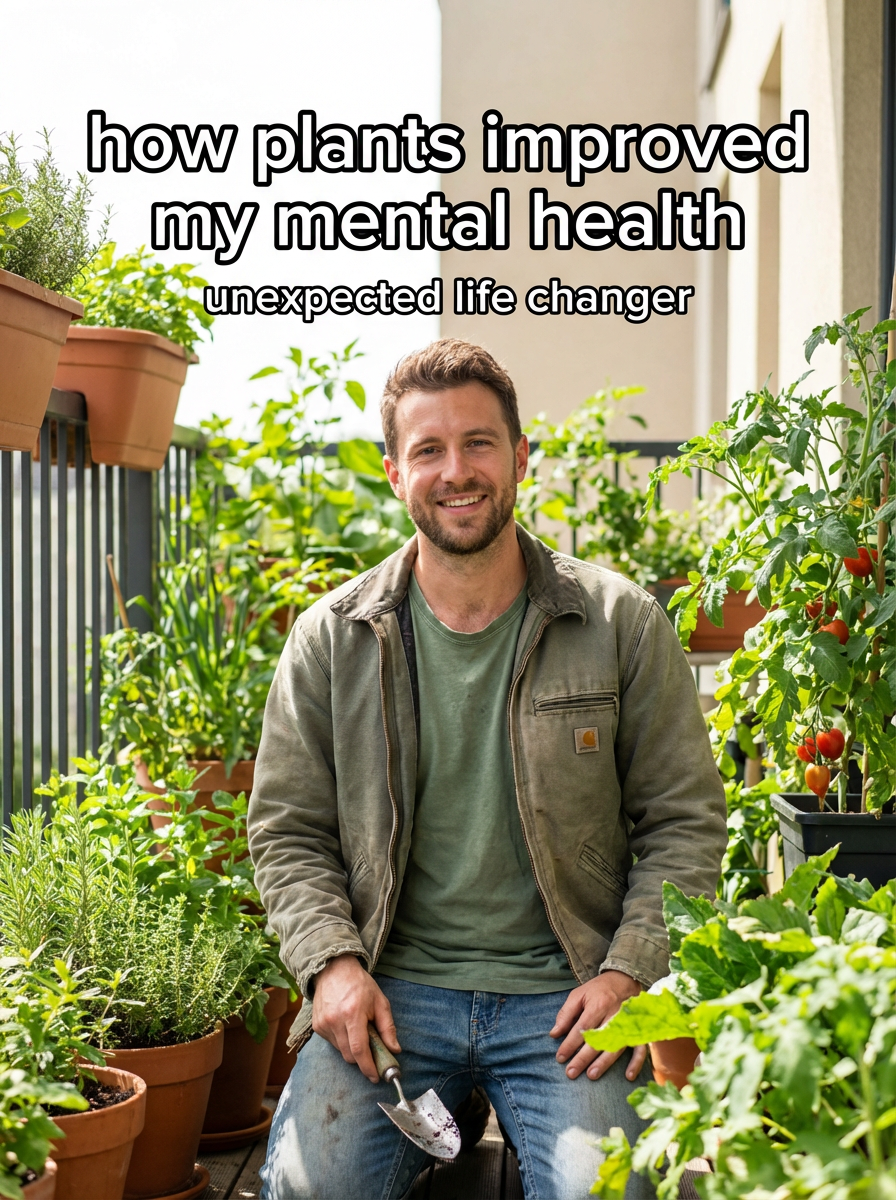 model in casual outdoor clothes tending to plants in apartment or balcony garden, natural sunlight, green plants everywhere. TikTok-style text overlay with white text with black outline: "how plants improved my mental health" smaller text: "(unexpected life changer)", do not show tiktok interface or logo