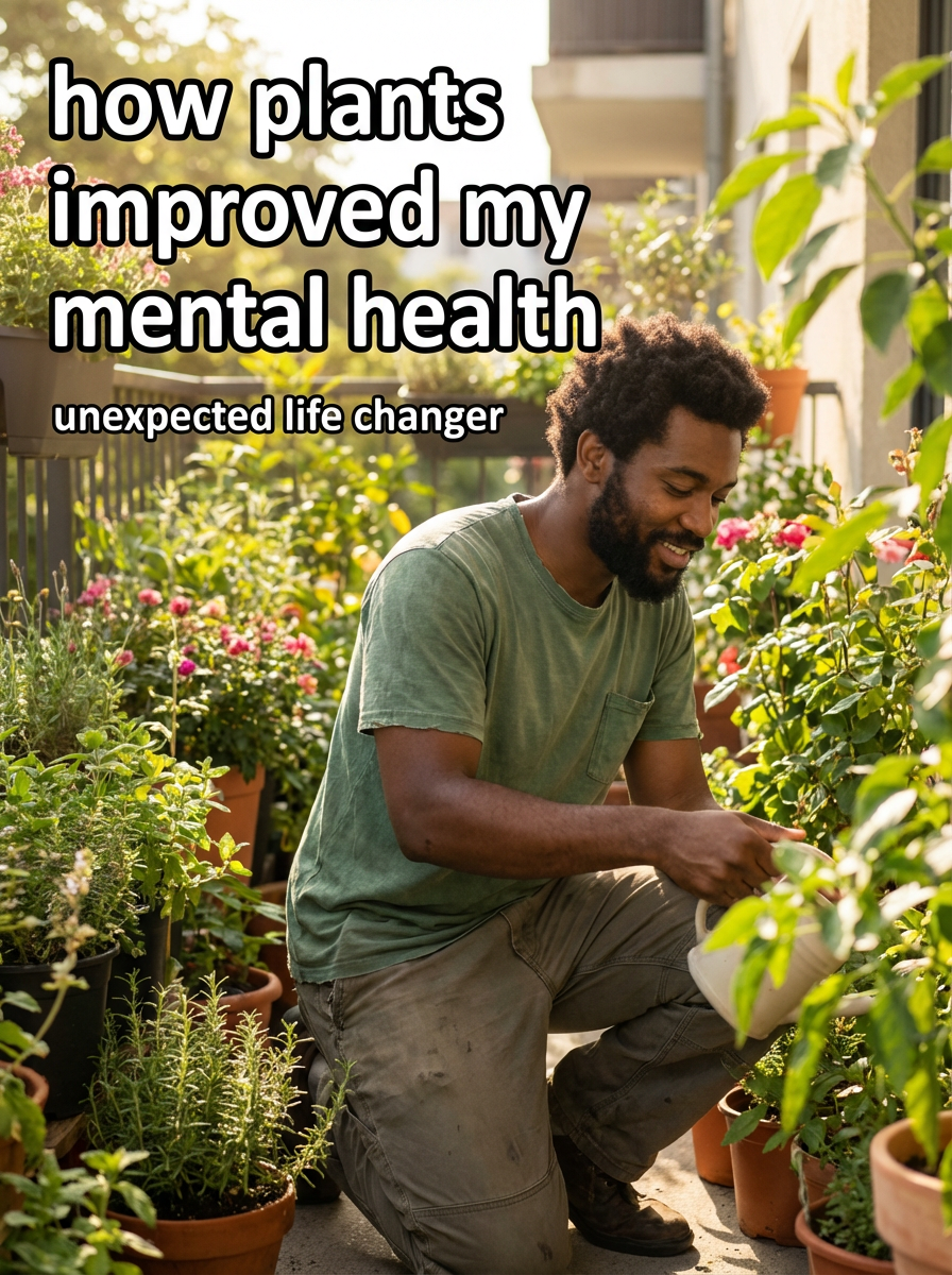 model in casual outdoor clothes tending to plants in apartment or balcony garden, natural sunlight, green plants everywhere. TikTok-style text overlay with white text with black outline: "how plants improved my mental health" smaller text: "(unexpected life changer)", do not show tiktok interface or logo