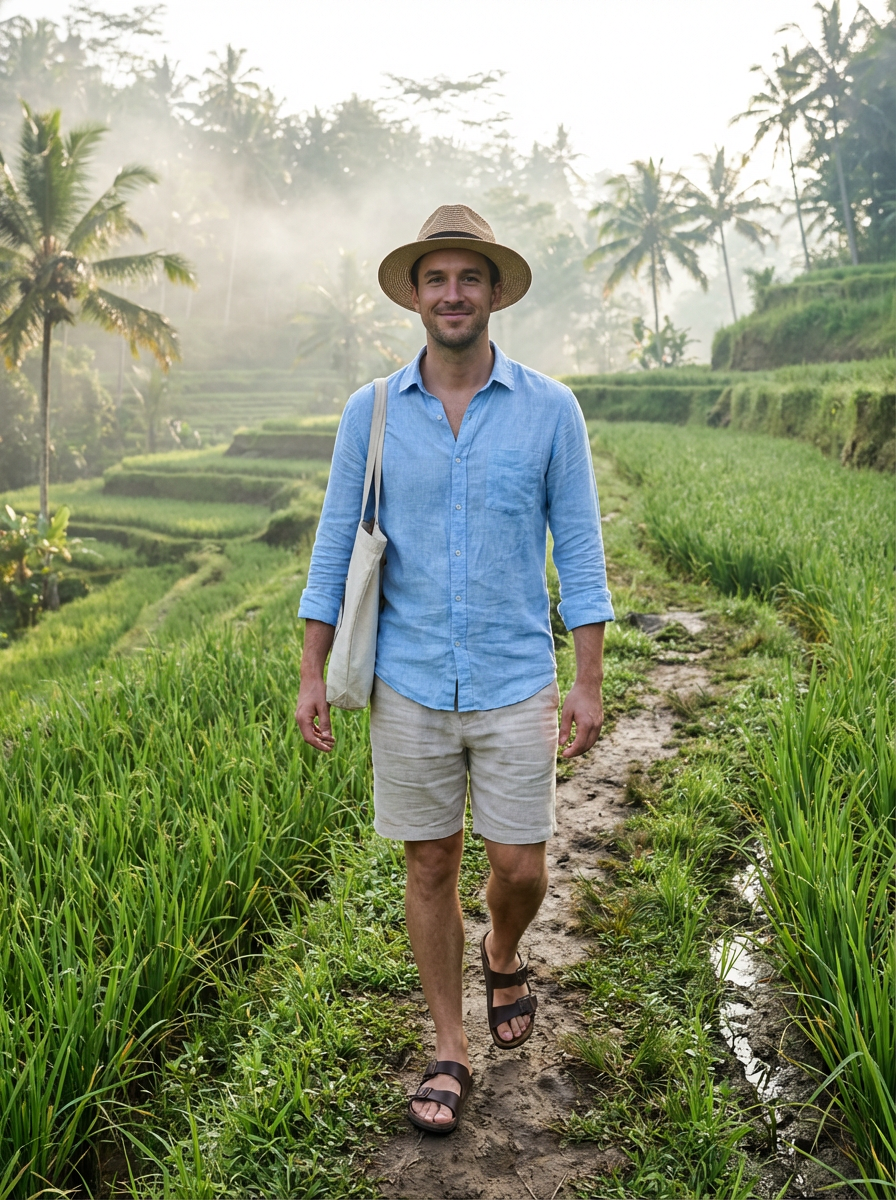 model in casual resort wear walking through terraced rice fields in Tegalalang, morning mist and palm trees in background
