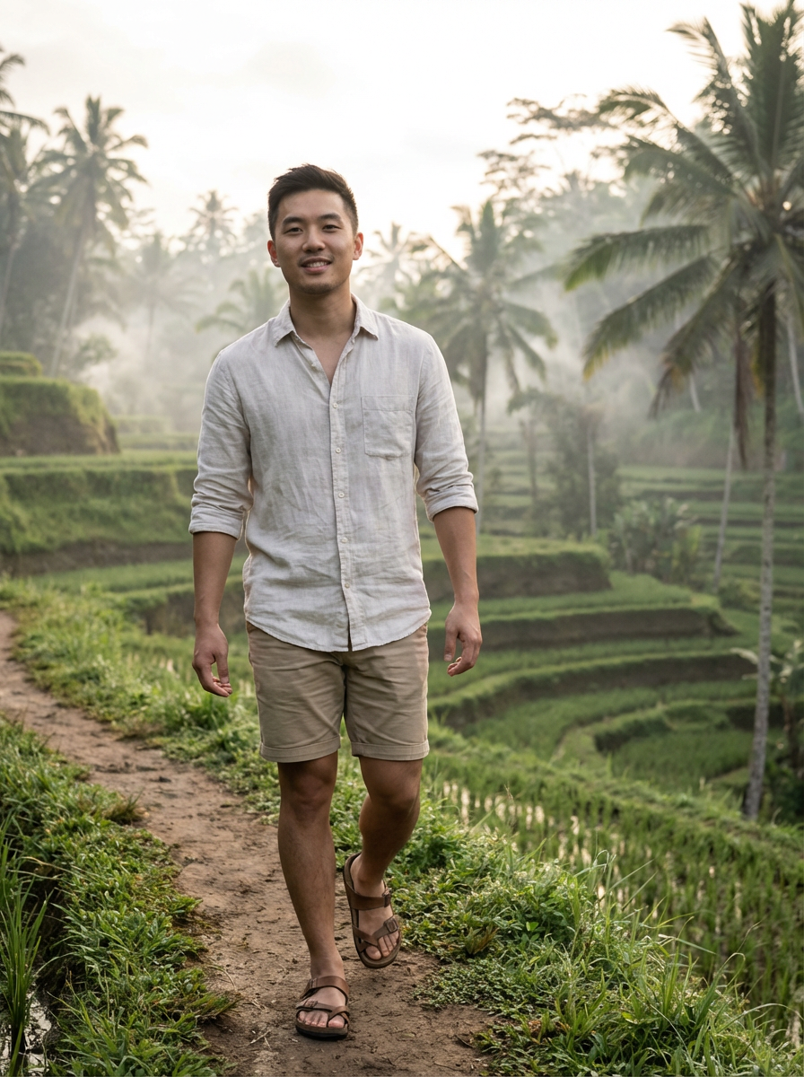 model in casual resort wear walking through terraced rice fields in Tegalalang, morning mist and palm trees in background