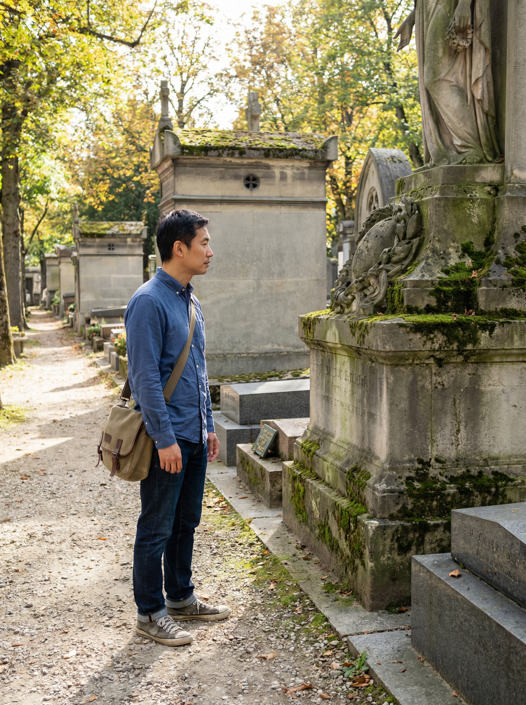 model in casual shirt, jeans, sneakers, messenger bag at Père Lachaise Cemetery, historic graves and monuments, peaceful cemetery paths, cultural pilgrimage site, respectful tourist moment, historical significance