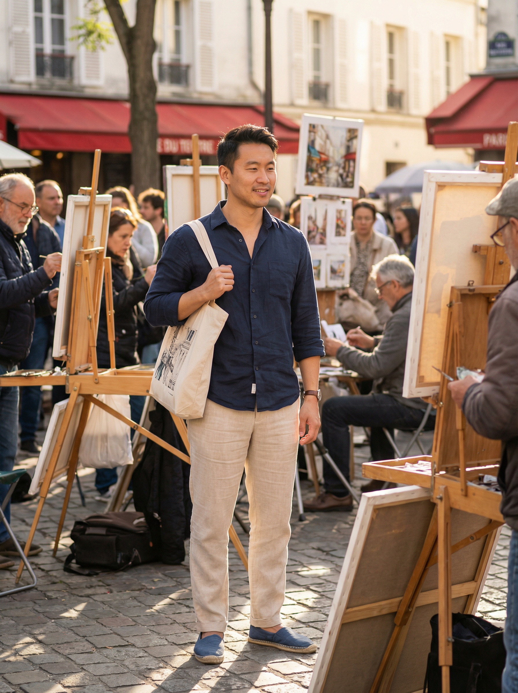 model in casual shirt, linen pants, espadrilles, canvas bag at Montmartre artists square watching street painters, artistic bohemian atmosphere, easels and artwork around, creative energy, warm artistic lighting