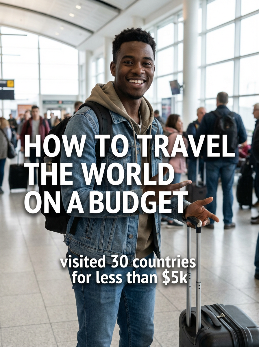 model in casual travel wear at airport or train station, luggage nearby, excited expression, natural lighting. TikTok text overlay: "how to travel the world on a budget" smaller text: "(visited 30 countries for less than $5k)", do not show tiktok interface