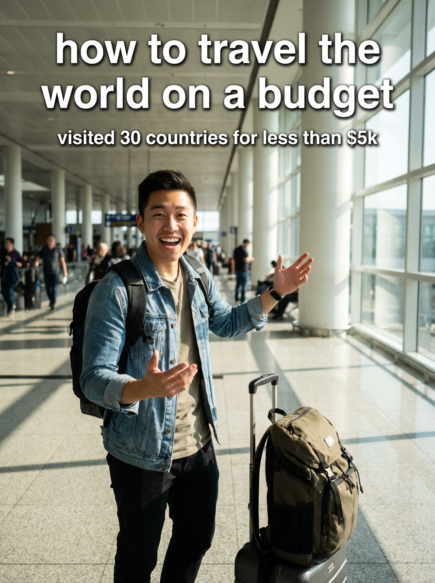 model in casual travel wear at airport or train station, luggage nearby, excited expression, natural lighting. TikTok text overlay: "how to travel the world on a budget" smaller text: "(visited 30 countries for less than $5k)", do not show tiktok interface