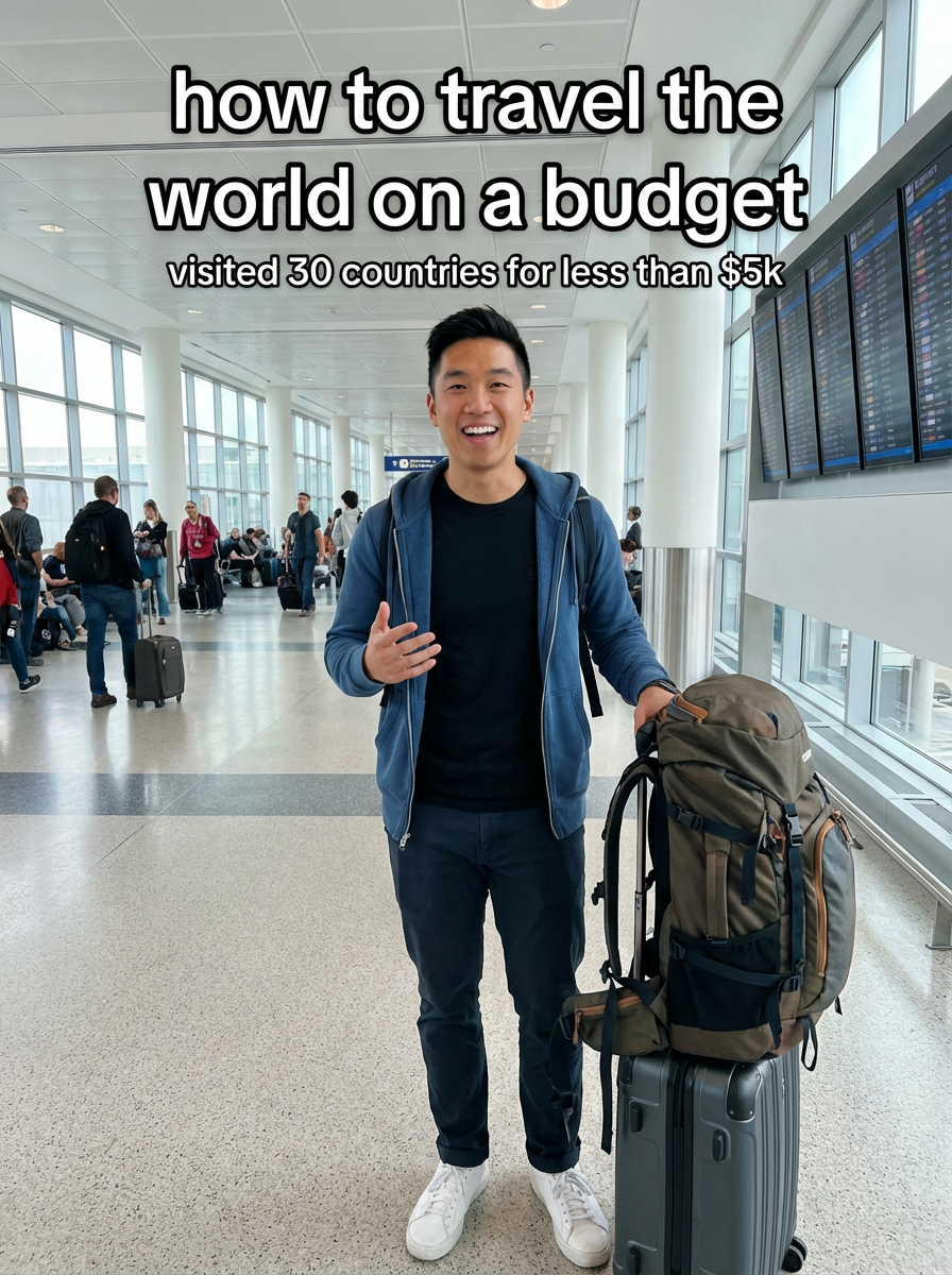 model in casual travel wear at airport or train station, luggage nearby, excited expression, natural lighting. TikTok TikTok-style text overlay with white text with black outline: "how to travel the world on a budget" smaller text: "(visited 30 countries for less than $5k)", do not show tiktok interface or logo