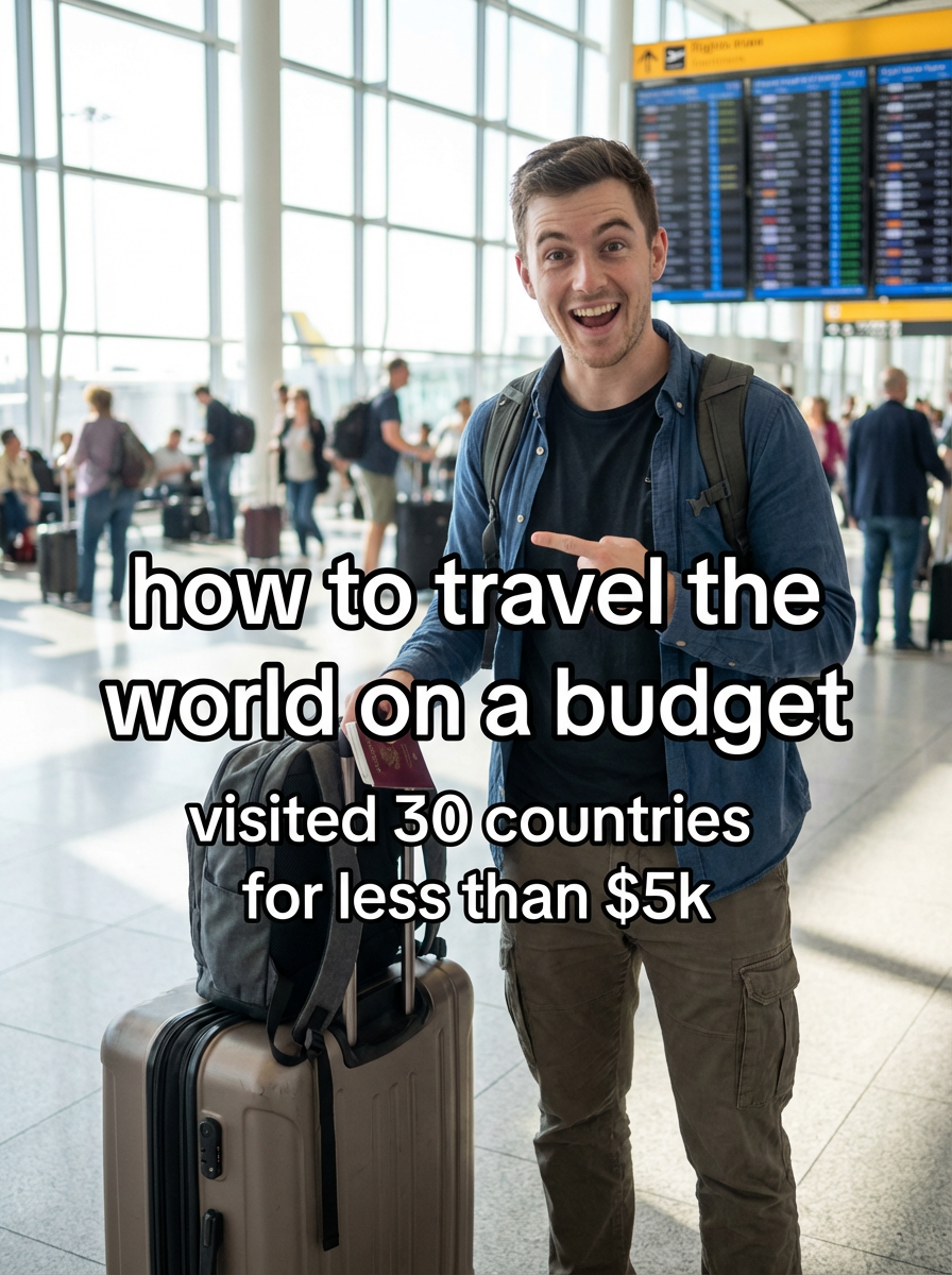 model in casual travel wear at airport or train station, luggage nearby, excited expression, natural lighting. TikTok TikTok-style text overlay with white text with black outline: "how to travel the world on a budget" smaller text: "(visited 30 countries for less than $5k)", do not show tiktok interface or logo