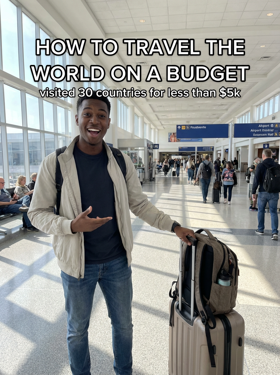 model in casual travel wear at airport or train station, luggage nearby, excited expression, natural lighting. TikTok-style text overlay with white text with black outline: "how to travel the world on a budget" smaller text: "(visited 30 countries for less than $5k)", do not show tiktok interface or logo