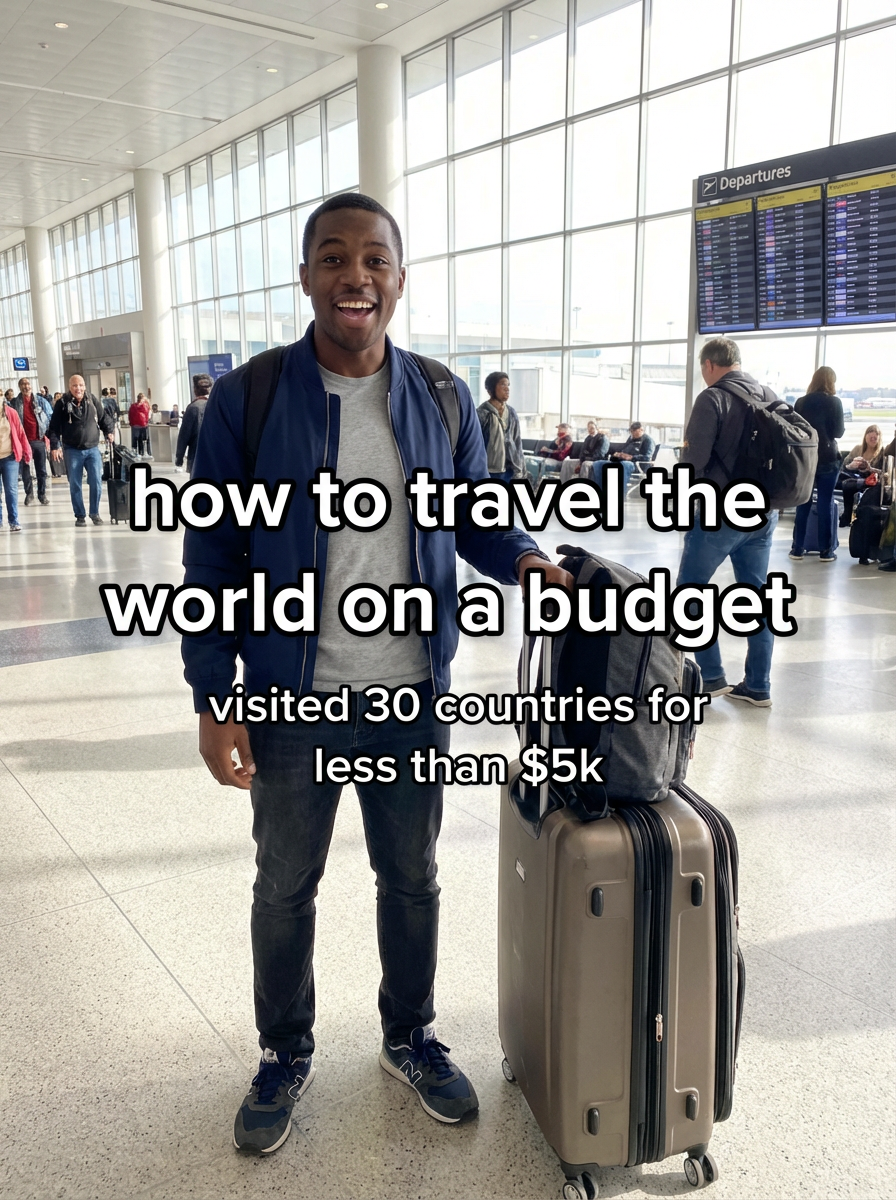 model in casual travel wear at airport or train station, luggage nearby, excited expression, natural lighting. TikTok-style text overlay with white text with black outline: "how to travel the world on a budget" smaller text: "(visited 30 countries for less than $5k)", do not show tiktok interface or logo