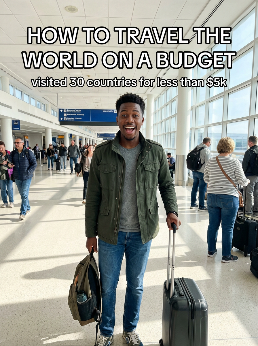 model in casual travel wear at airport or train station, luggage nearby, excited expression, natural lighting. TikTok-style text overlay with white text with black outline: "how to travel the world on a budget" smaller text: "(visited 30 countries for less than $5k)", do not show tiktok interface or logo