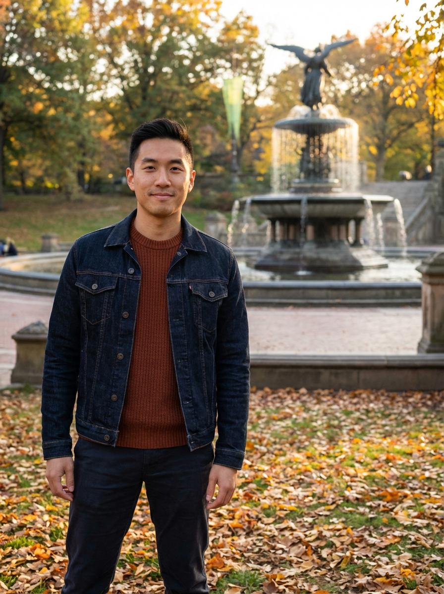 model in Central Park, autumn leaves, Bethesda Fountain background, cozy fall outfit, warm natural lighting