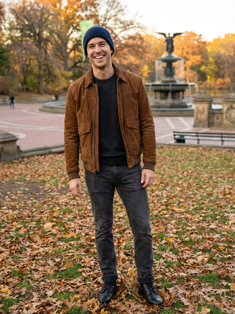 model in Central Park, autumn leaves, Bethesda Fountain background, cozy fall outfit, warm natural lighting