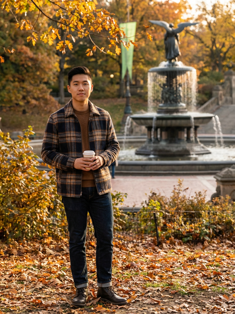 model in Central Park, autumn leaves, Bethesda Fountain background, cozy fall outfit, warm natural lighting