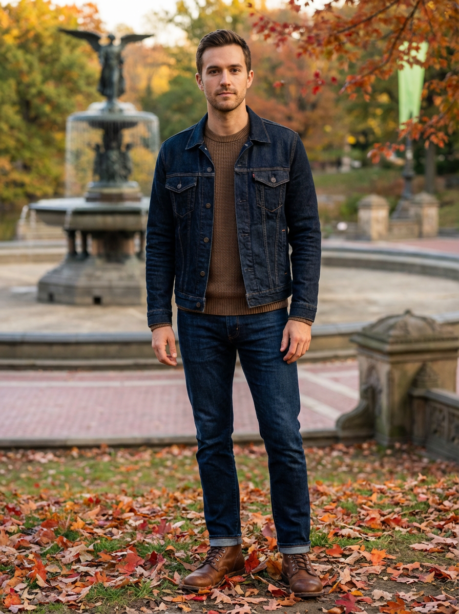 model in Central Park, autumn leaves, Bethesda Fountain background, cozy fall outfit, warm natural lighting
