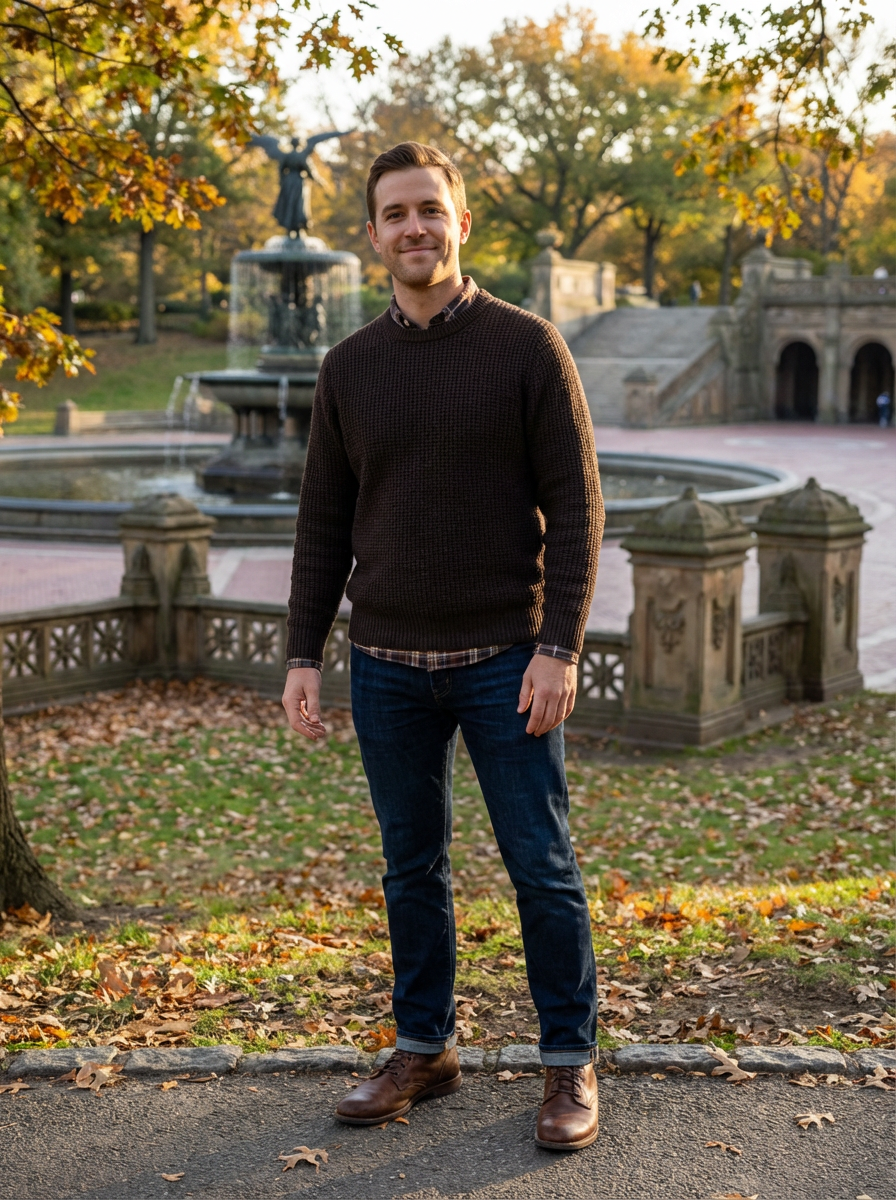 model in Central Park, autumn leaves, Bethesda Fountain background, cozy fall outfit, warm natural lighting