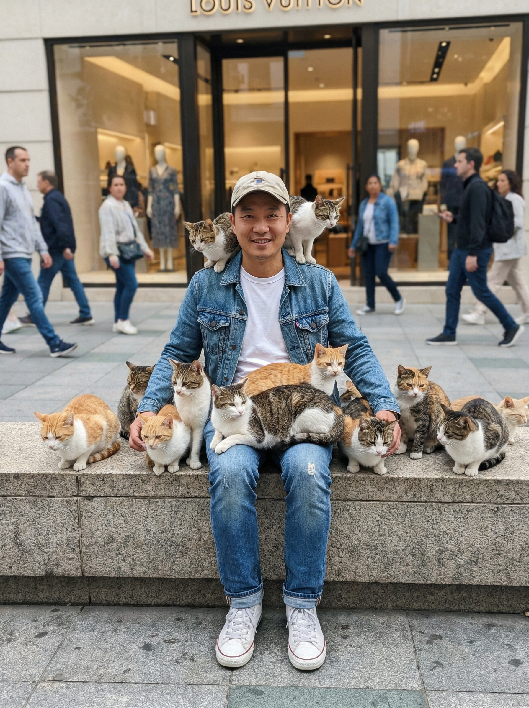 model in clean streetwear: denim jacket, relaxed jeans, white tee, sneakers, cap sitting on a stone ledge outside a high-end boutique on a busy city street, 15 cats of different colors lounging on and around the model like a fashion entourage, candid street photo vibe, natural daylight, shallow depth of field