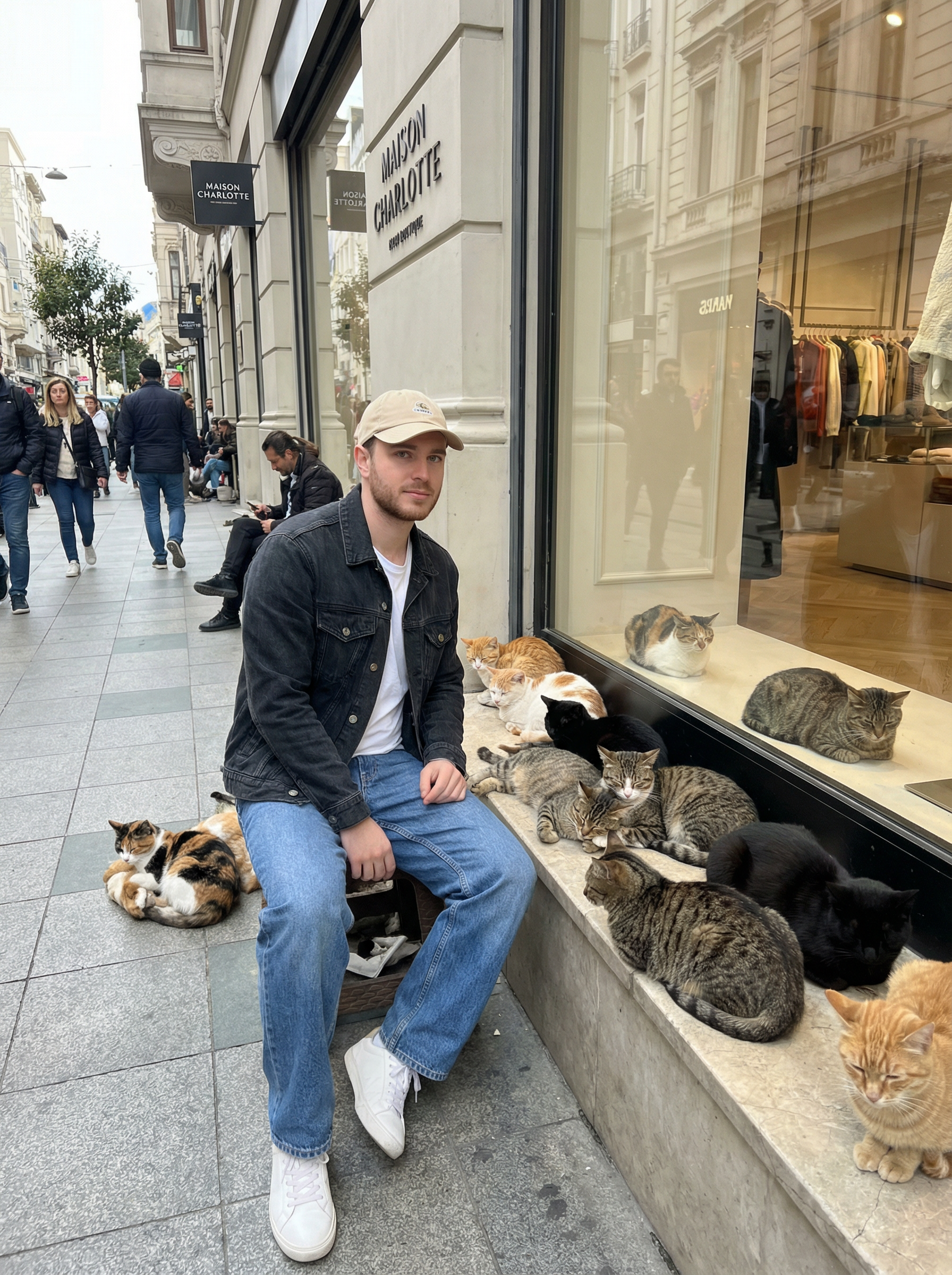 model in clean streetwear: denim jacket, relaxed jeans, white tee, sneakers, cap sitting on a stone ledge outside a high-end boutique on a busy city street, 15 cats of different colors lounging on and around the model like a fashion entourage, candid street photo vibe, natural daylight, shallow depth of field