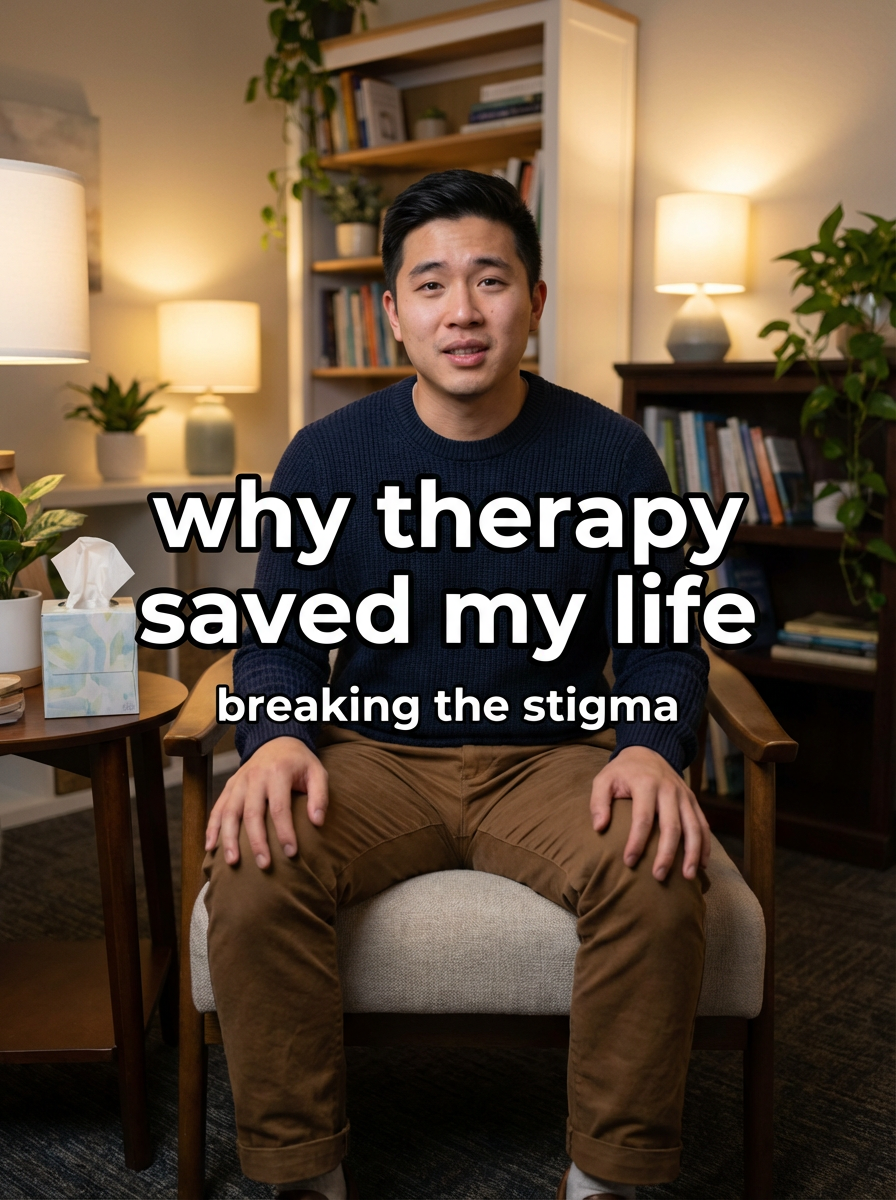 model in comfortable counseling attire in cozy therapy office, tissues nearby, vulnerable but hopeful expression, soft lighting. TikTok TikTok-style text overlay with white text with black outline: "why therapy saved my life" smaller text: "(breaking the stigma)", do not show tiktok interface or logo