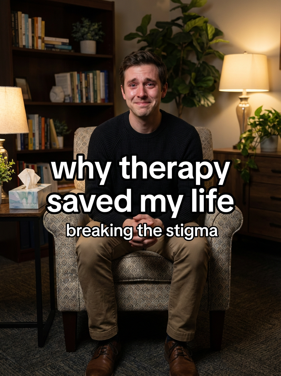 model in comfortable counseling attire in cozy therapy office, tissues nearby, vulnerable but hopeful expression, soft lighting. TikTok TikTok-style text overlay with white text with black outline: "why therapy saved my life" smaller text: "(breaking the stigma)", do not show tiktok interface or logo
