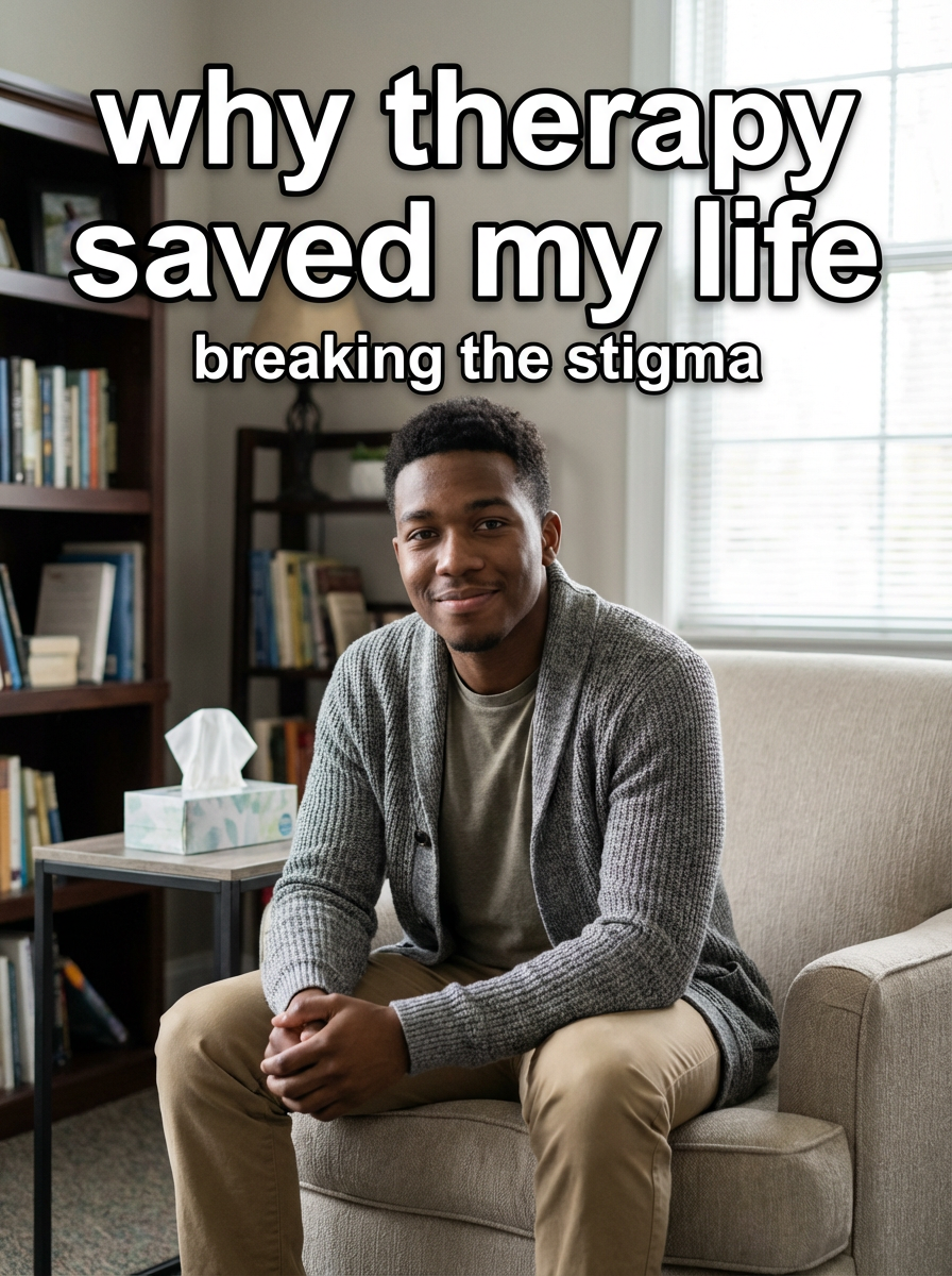 model in comfortable counseling attire in cozy therapy office, tissues nearby, vulnerable but hopeful expression, soft lighting. TikTok-style text overlay with white text with black outline: "why therapy saved my life" smaller text: "(breaking the stigma)", do not show tiktok interface or logo