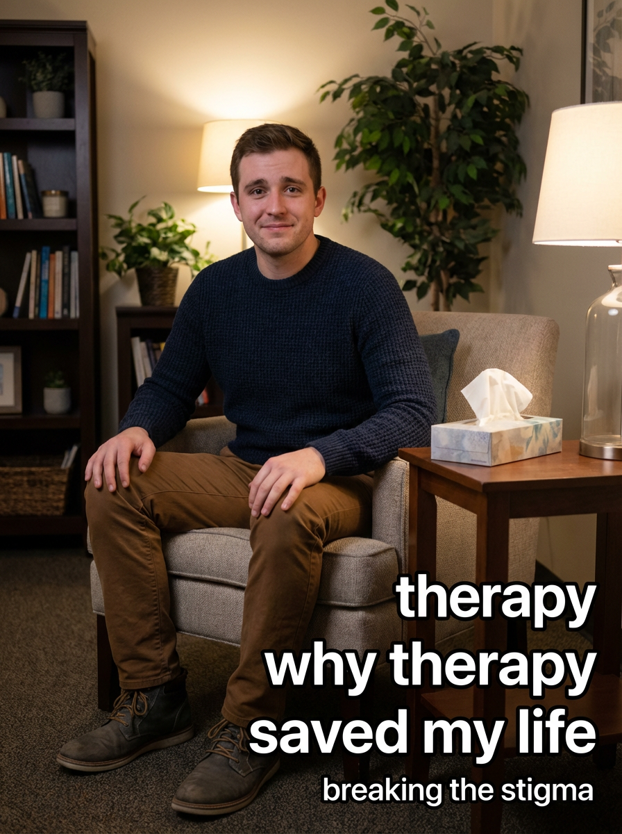 model in comfortable counseling attire in cozy therapy office, tissues nearby, vulnerable but hopeful expression, soft lighting. TikTok-style text overlay with white text with black outline: "why therapy saved my life" smaller text: "(breaking the stigma)", do not show tiktok interface or logo