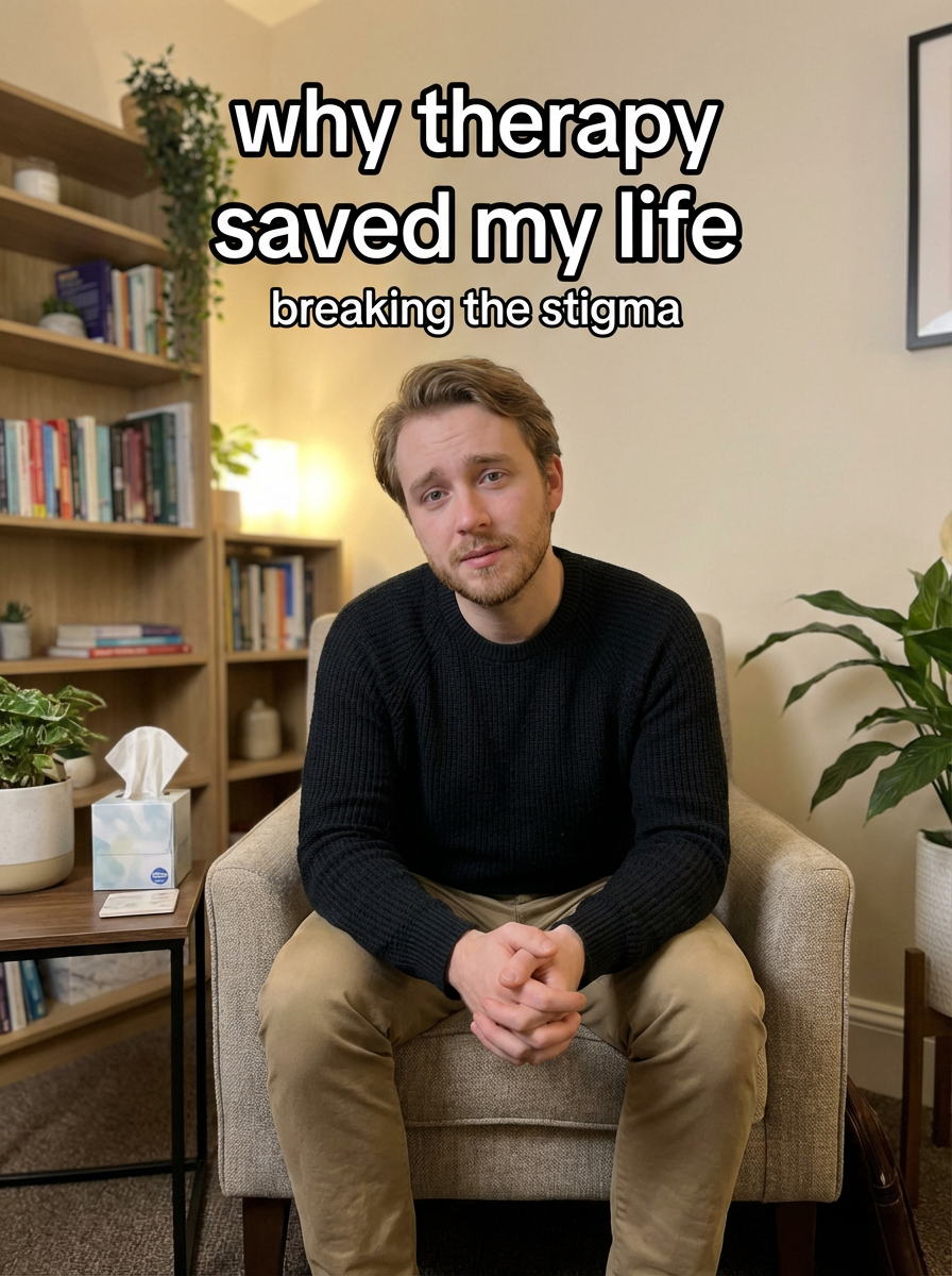 model in comfortable counseling attire in cozy therapy office, tissues nearby, vulnerable but hopeful expression, soft lighting. TikTok-style text overlay with white text with black outline: "why therapy saved my life" smaller text: "(breaking the stigma)", do not show tiktok interface or logo