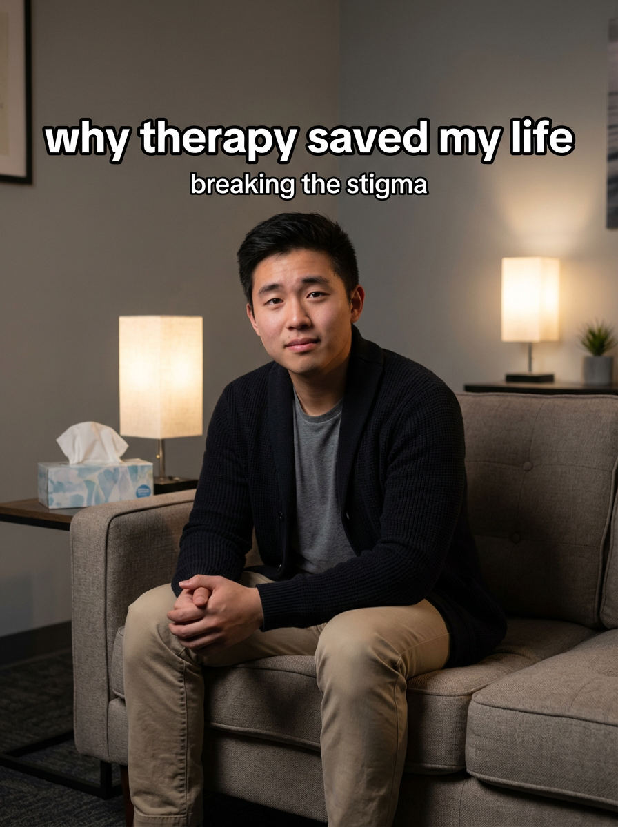 model in comfortable counseling attire in cozy therapy office, tissues nearby, vulnerable but hopeful expression, soft lighting. TikTok-style text overlay with white text with black outline: "why therapy saved my life" smaller text: "(breaking the stigma)", do not show tiktok interface or logo