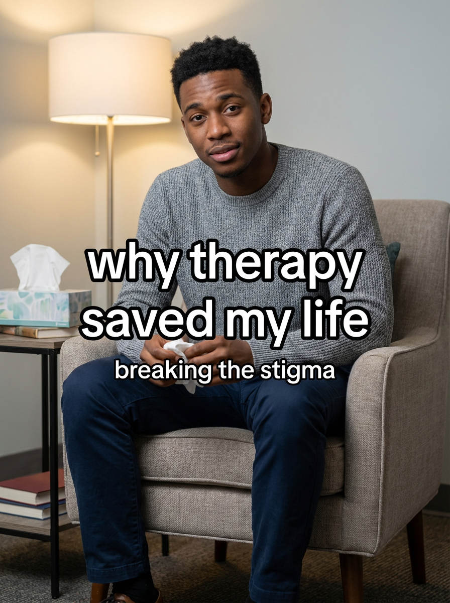 model in comfortable counseling attire in cozy therapy office, tissues nearby, vulnerable but hopeful expression, soft lighting. TikTok-style text overlay with white text with black outline: "why therapy saved my life" smaller text: "(breaking the stigma)", do not show tiktok interface or logo