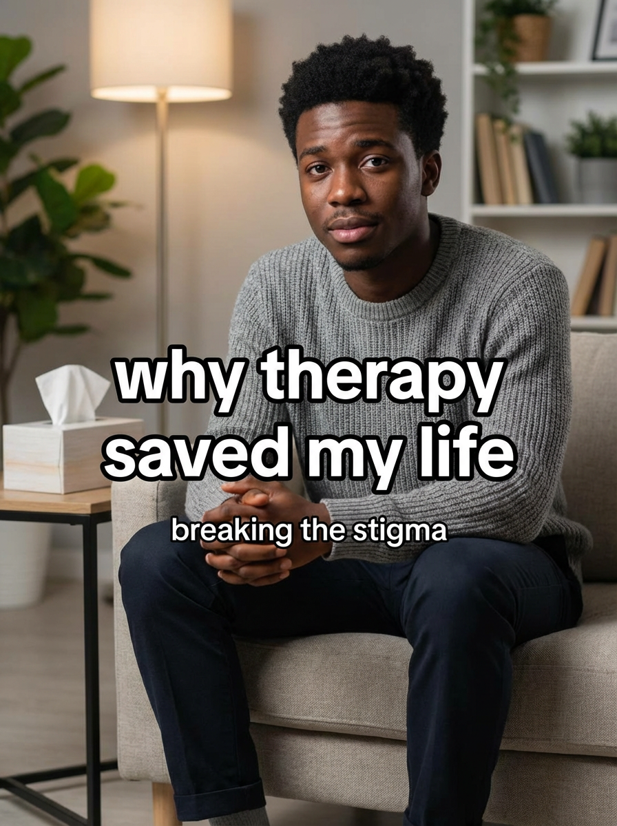 model in comfortable counseling attire in cozy therapy office, tissues nearby, vulnerable but hopeful expression, soft lighting. TikTok-style text overlay with white text with black outline: "why therapy saved my life" smaller text: "(breaking the stigma)", do not show tiktok interface or logo