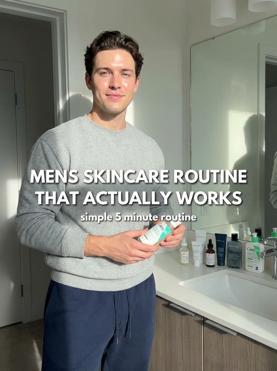 model in comfortable loungewear in bathroom with skincare products, glowing skin, soft lighting. TikTok text overlay: "mens skincare routine that actually works" smaller text: "(simple 5 minute routine)", do not show tiktok interface