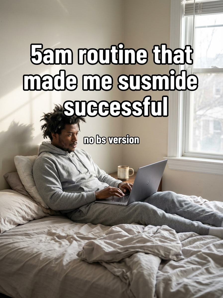 model in comfortable loungewear sitting on unmade bed with laptop, messy hair, coffee cup nearby, morning sunlight, cozy bedroom aesthetic. TikTok TikTok-style text overlay with white text with black outline: "5am routine that made me successful" smaller text: "(no bs version)", do not show tiktok interface or logo