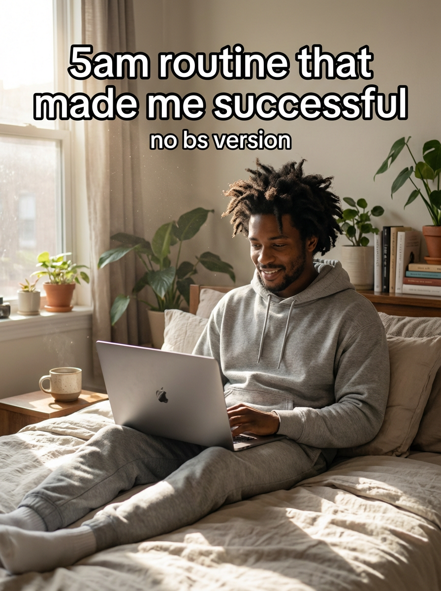 model in comfortable loungewear sitting on unmade bed with laptop, messy hair, coffee cup nearby, morning sunlight, cozy bedroom aesthetic. TikTok-style text overlay with white text with black outline: "5am routine that made me successful" smaller text: "(no bs version)", do not show tiktok interface or logo