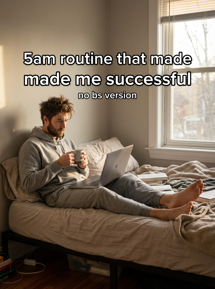 model in comfortable loungewear sitting on unmade bed with laptop, messy hair, coffee cup nearby, morning sunlight, cozy bedroom aesthetic. TikTok-style text overlay with white text with black outline: "5am routine that made me successful" smaller text: "(no bs version)", do not show tiktok interface or logo