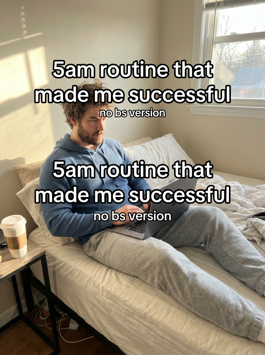 model in comfortable loungewear sitting on unmade bed with laptop, messy hair, coffee cup nearby, morning sunlight, cozy bedroom aesthetic. TikTok-style text overlay with white text with black outline: "5am routine that made me successful" smaller text: "(no bs version)", do not show tiktok interface or logo