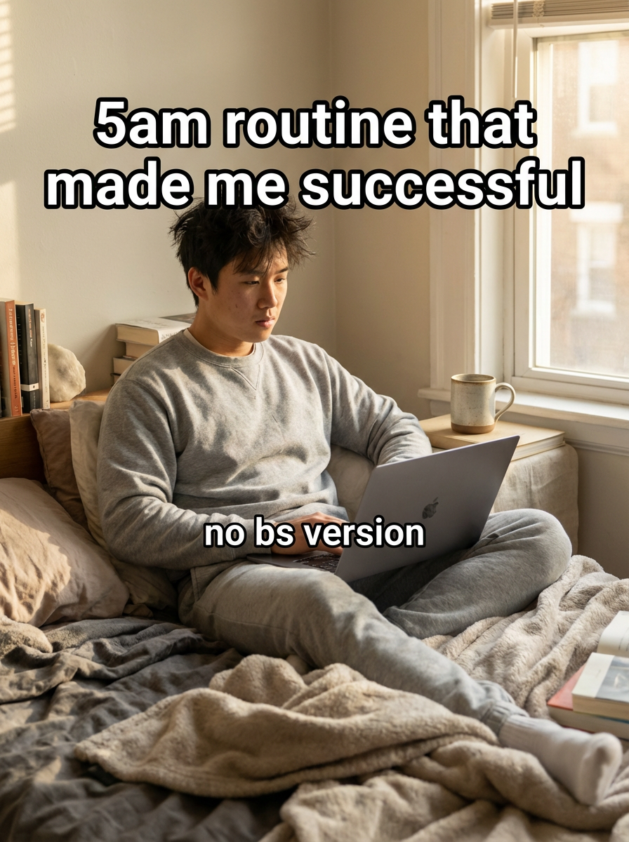 model in comfortable loungewear sitting on unmade bed with laptop, messy hair, coffee cup nearby, morning sunlight, cozy bedroom aesthetic. TikTok-style text overlay with white text with black outline: "5am routine that made me successful" smaller text: "(no bs version)", do not show tiktok interface or logo