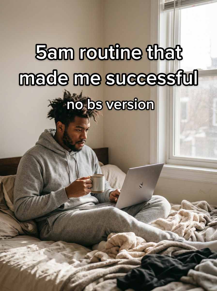 model in comfortable loungewear sitting on unmade bed with laptop, messy hair, coffee cup nearby, morning sunlight, cozy bedroom aesthetic. TikTok-style text overlay with white text with black outline: "5am routine that made me successful" smaller text: "(no bs version)", do not show tiktok interface or logo