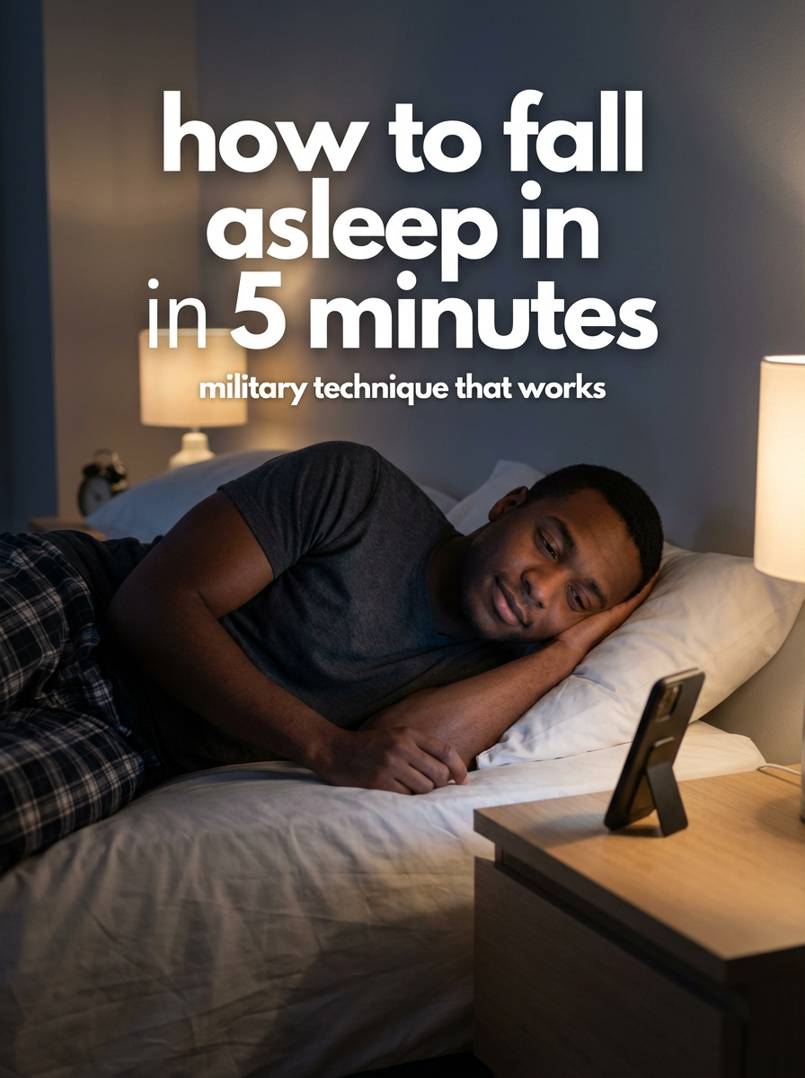 model in comfortable sleepwear in bedroom, phone on nightstand, peaceful expression, dim evening lighting. TikTok text overlay: "how to fall asleep in 5 minutes" smaller text: "(military technique that works)", do not show tiktok interface