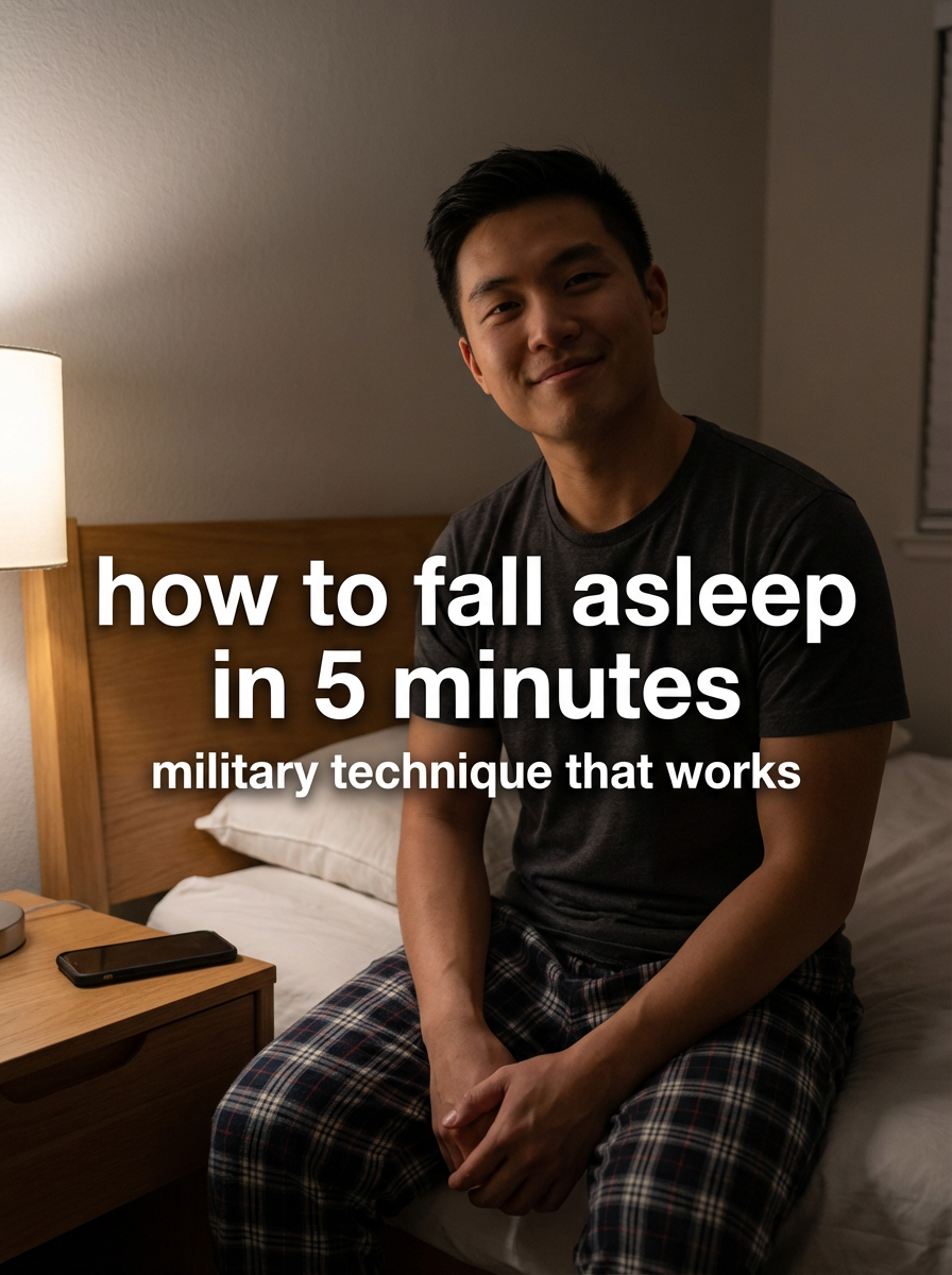 model in comfortable sleepwear in bedroom, phone on nightstand, peaceful expression, dim evening lighting. TikTok text overlay: "how to fall asleep in 5 minutes" smaller text: "(military technique that works)", do not show tiktok interface