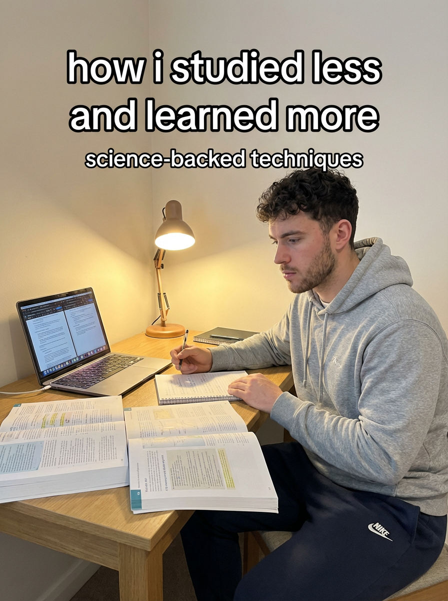 model in comfortable study clothes at desk with textbooks and laptop, focused expression, desk lamp lighting. TikTok TikTok-style text overlay with white text with black outline: "how i studied less and learned more" smaller text: "(science-backed techniques)", do not show tiktok interface or logo
