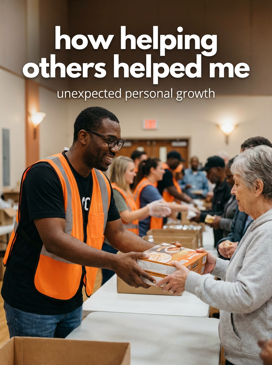 model in community service attire at community center or charity event, helping others, warm community lighting. TikTok text overlay: "how helping others helped me" smaller text: "(unexpected personal growth)", do not show tiktok interface