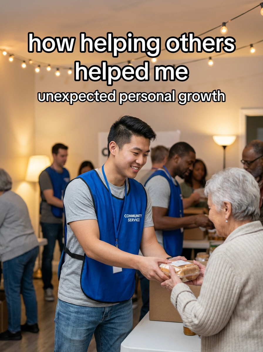 model in community service attire at community center or charity event, helping others, warm community lighting. TikTok TikTok-style text overlay with white text with black outline: "how helping others helped me" smaller text: "(unexpected personal growth)", do not show tiktok interface or logo