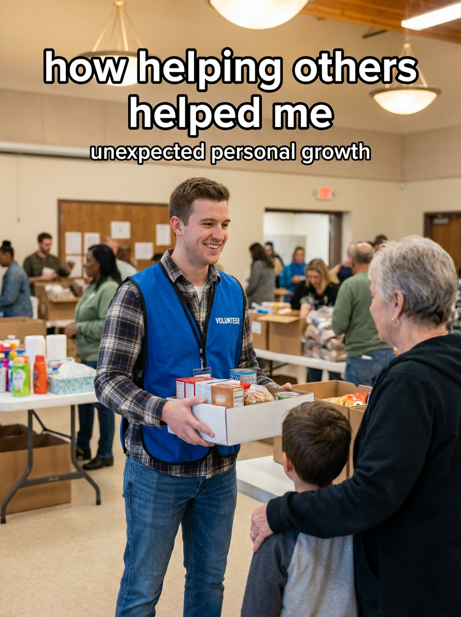 model in community service attire at community center or charity event, helping others, warm community lighting. TikTok TikTok-style text overlay with white text with black outline: "how helping others helped me" smaller text: "(unexpected personal growth)", do not show tiktok interface or logo
