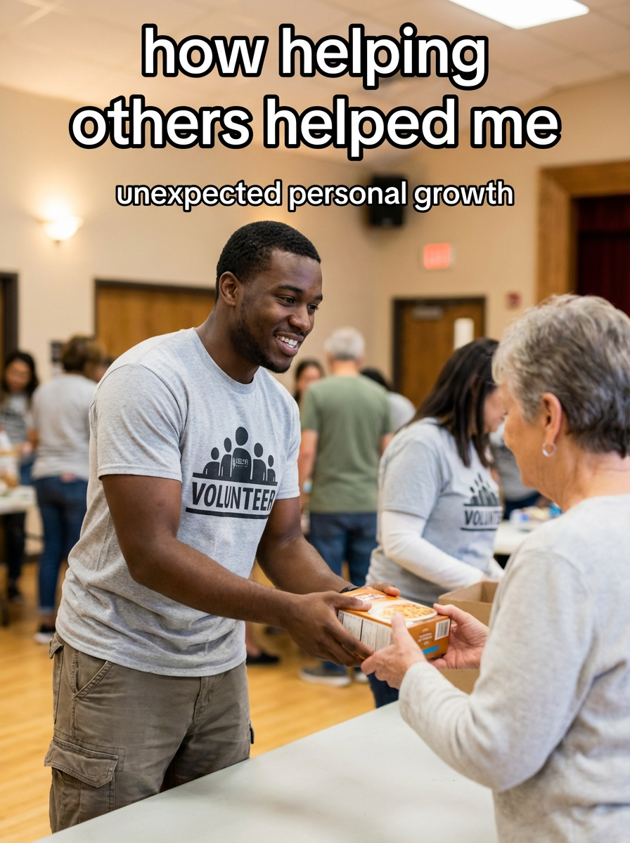 model in community service attire at community center or charity event, helping others, warm community lighting. instagram-style text overlay with white text with black outline: "how helping others helped me" smaller text: "(unexpected personal growth)", do not show instagram interface or logo