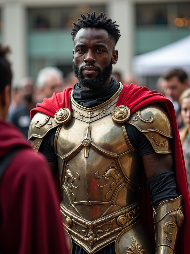model in cosplay group photo, wearing a heroic paladin costume with glowing armor, interacting with other cosplayers, vibrant and fun atmosphere