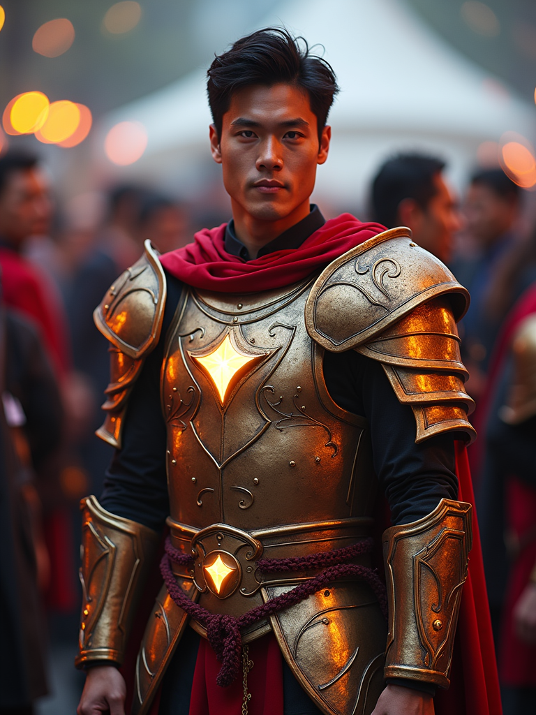 model in cosplay group photo, wearing a heroic paladin costume with glowing armor, interacting with other cosplayers, vibrant and fun atmosphere